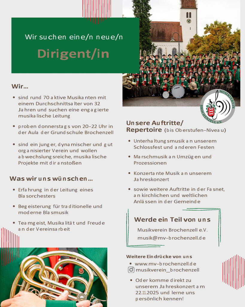 Wir suchen einen Dirigent(-in) Oktober 27, 2025 | Keine Kommentare Musikverein Brochenzell Stellenanzeigen